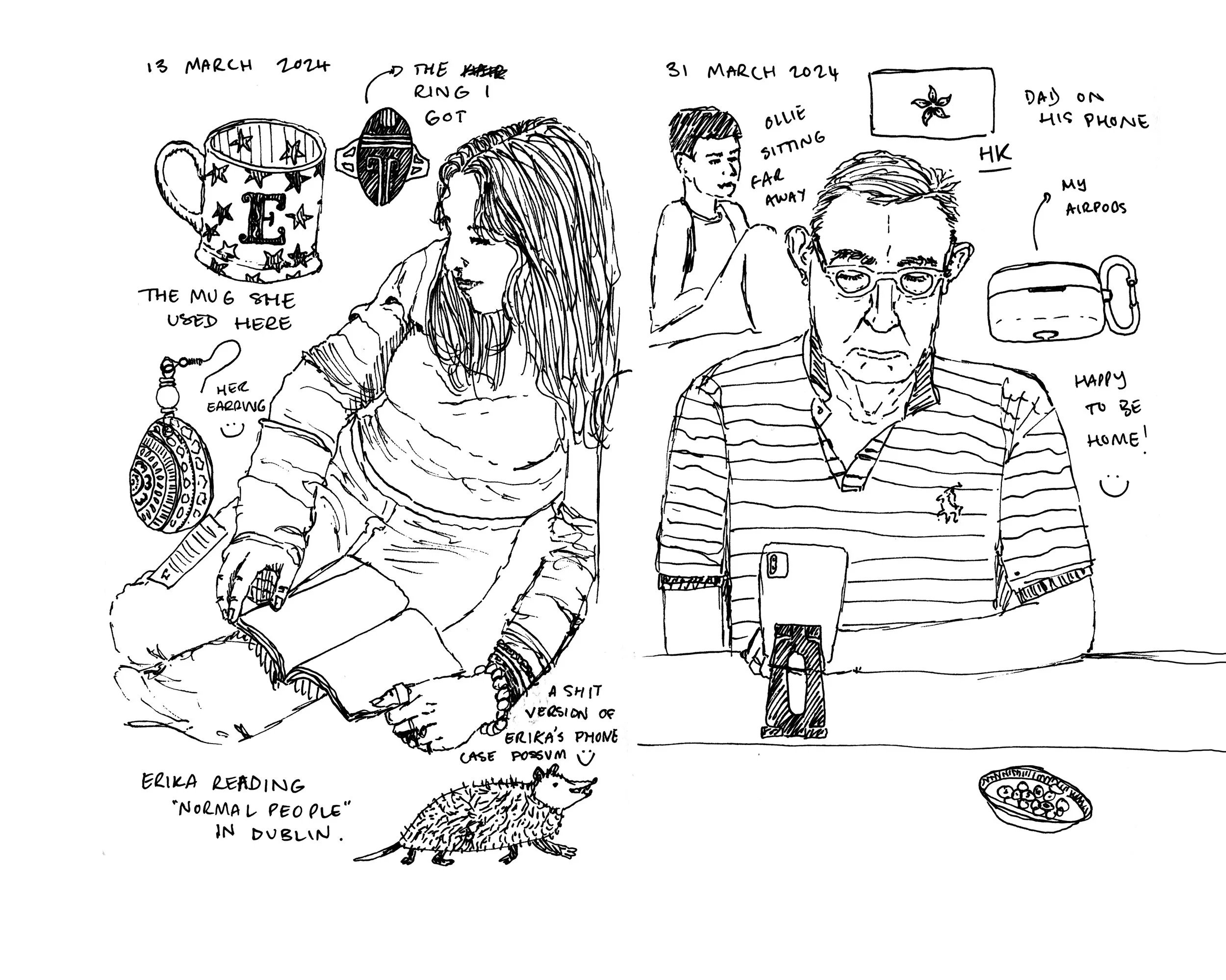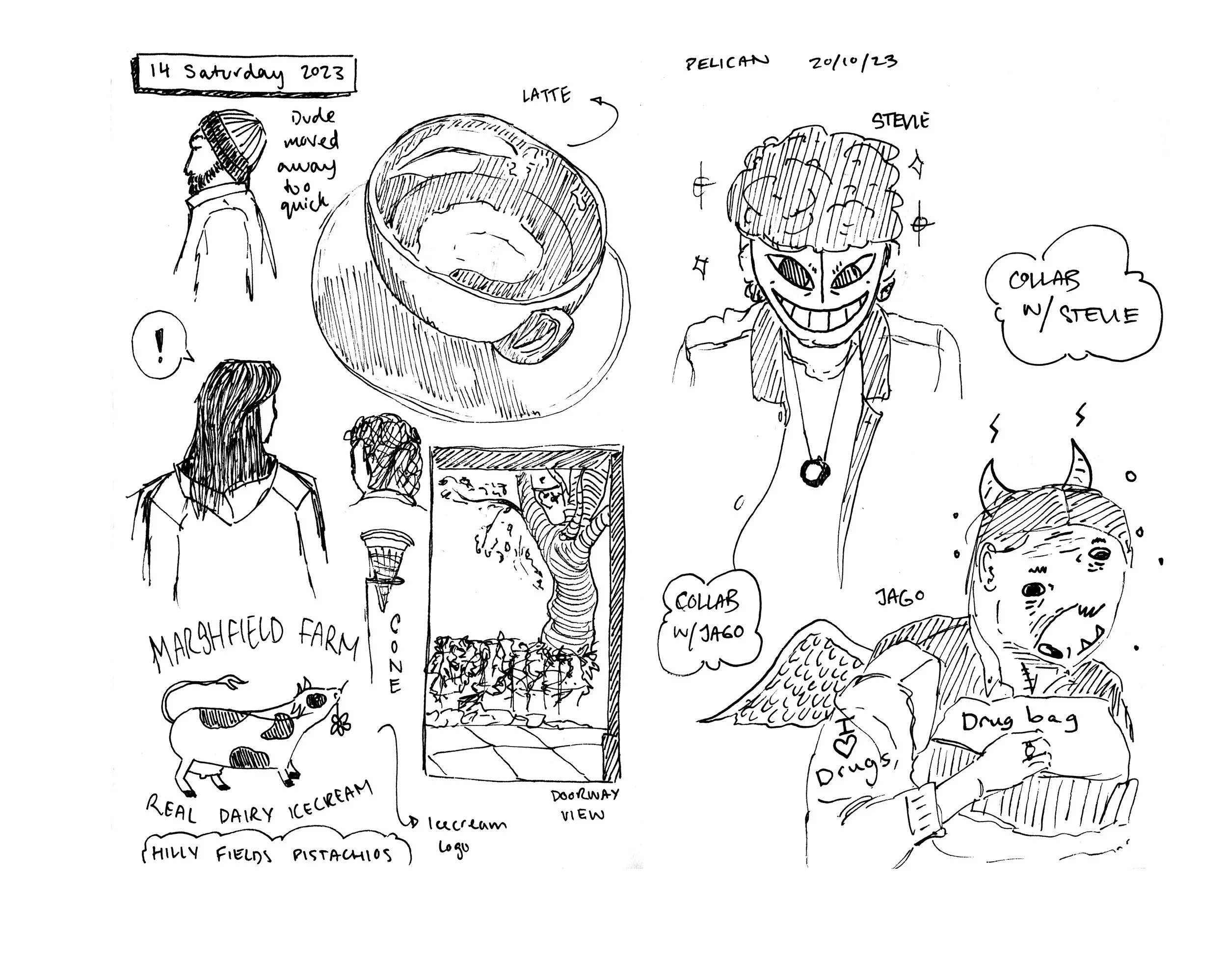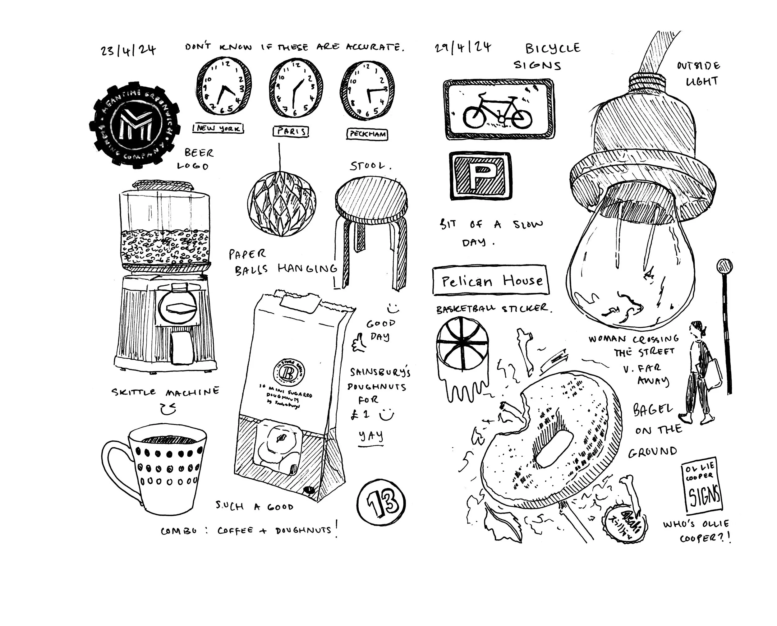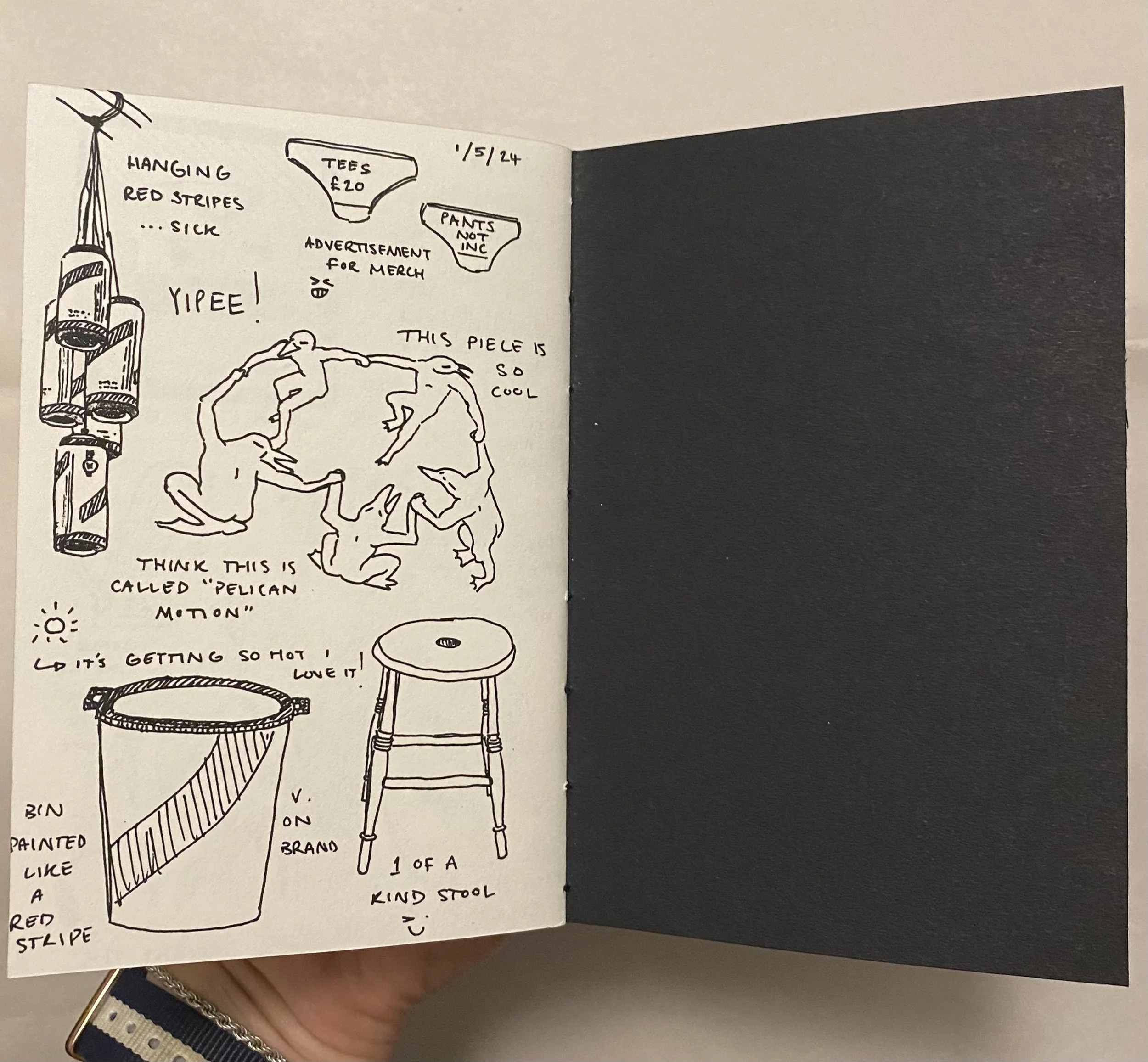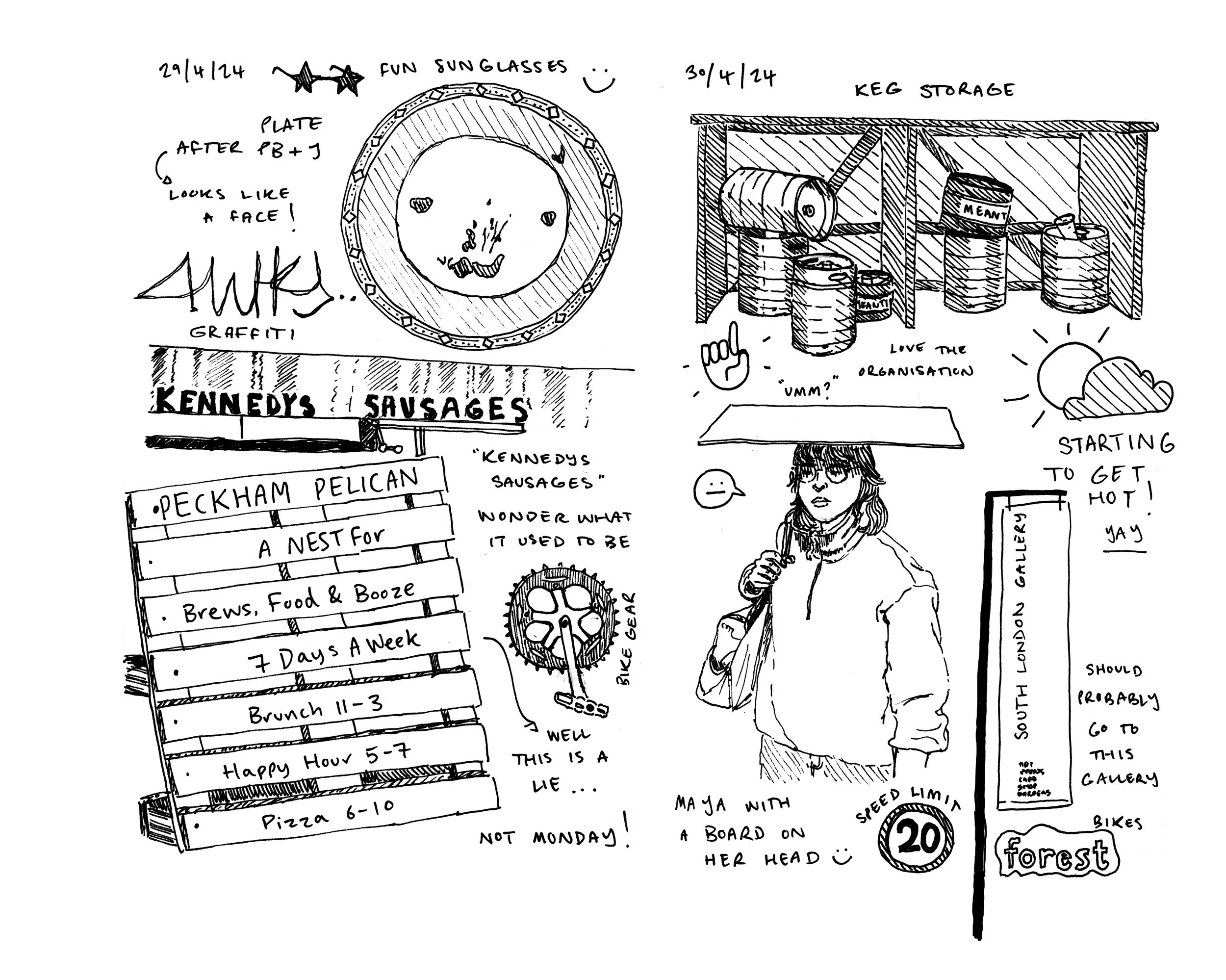 This installation immerses the audience into my experience of sitting in the Peckham Pelican Pub. This location has been a constant throughout my time at university as primarily a space for my friends and I to get her and unwind. Using a field note mapping method I sketched my surroundings and documented details through text and image. Recreating my personal sketchbook in this facsimile book allows the audience to see my observational illustration practice which definitely has improved during the process.