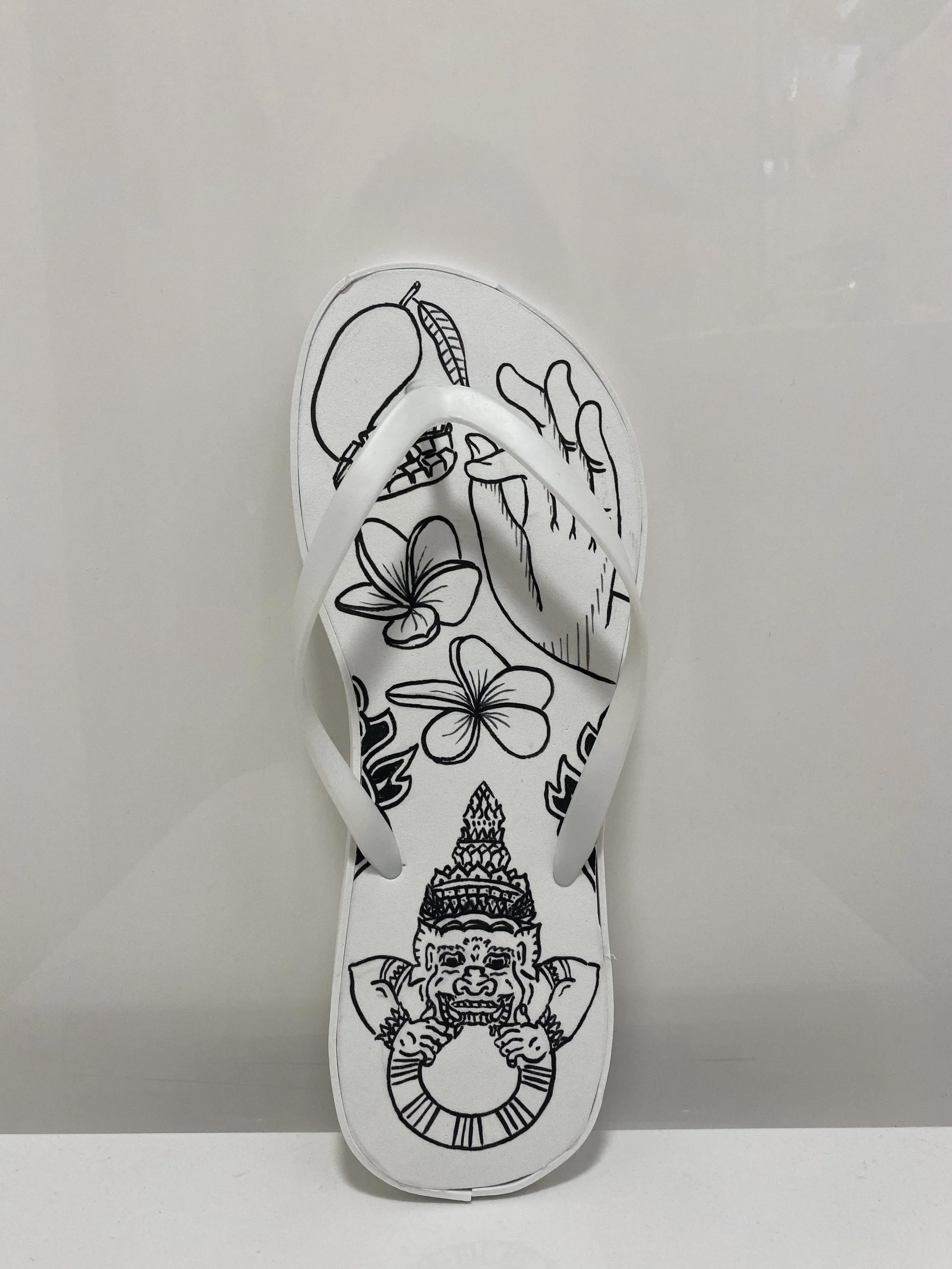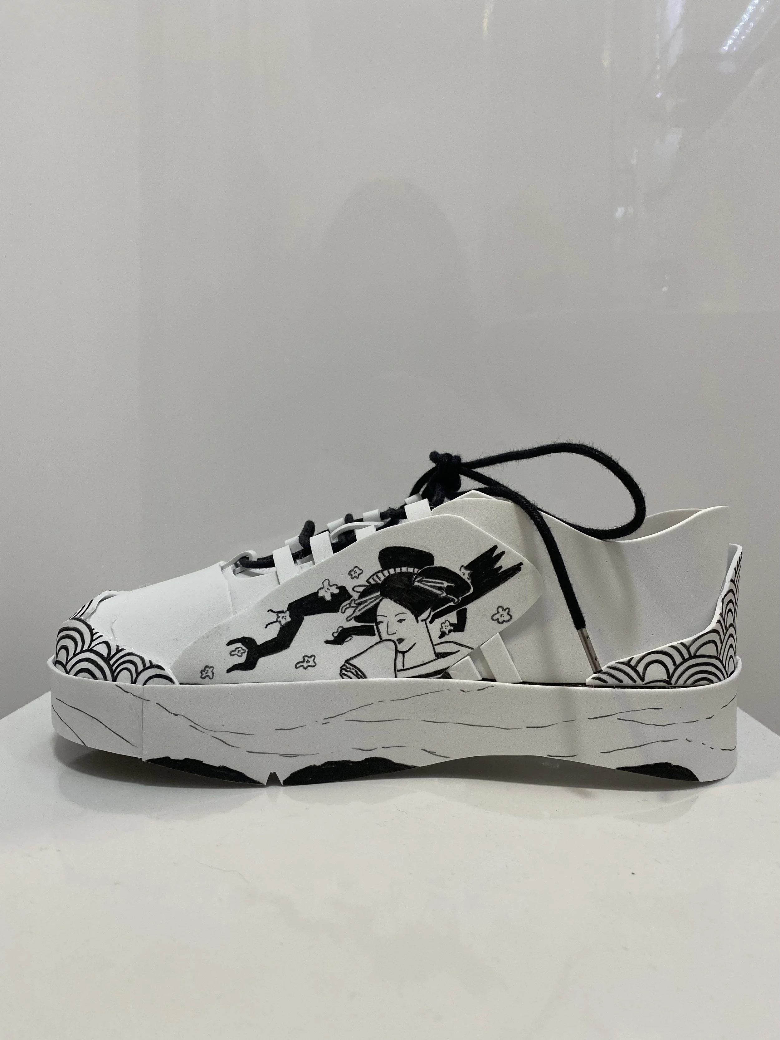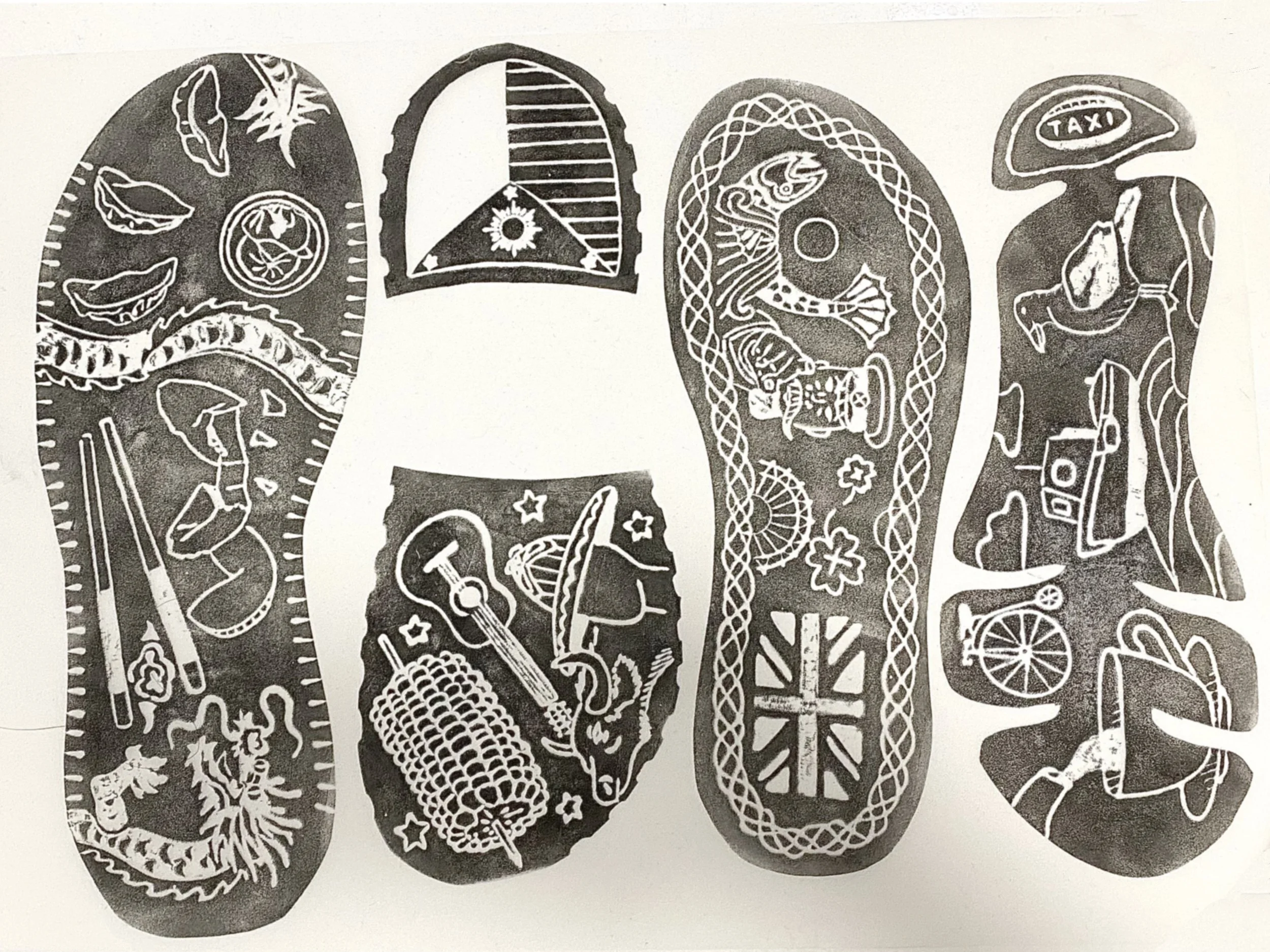 The four shoes and their footprints are representative of four people who have mixed Asian heritage. The surface illustrations on the shoes show the culture that comes through more prominently in their appearance and the illustrations in the footprints show the other half of their ethnicity mix which is not seen as clearly.