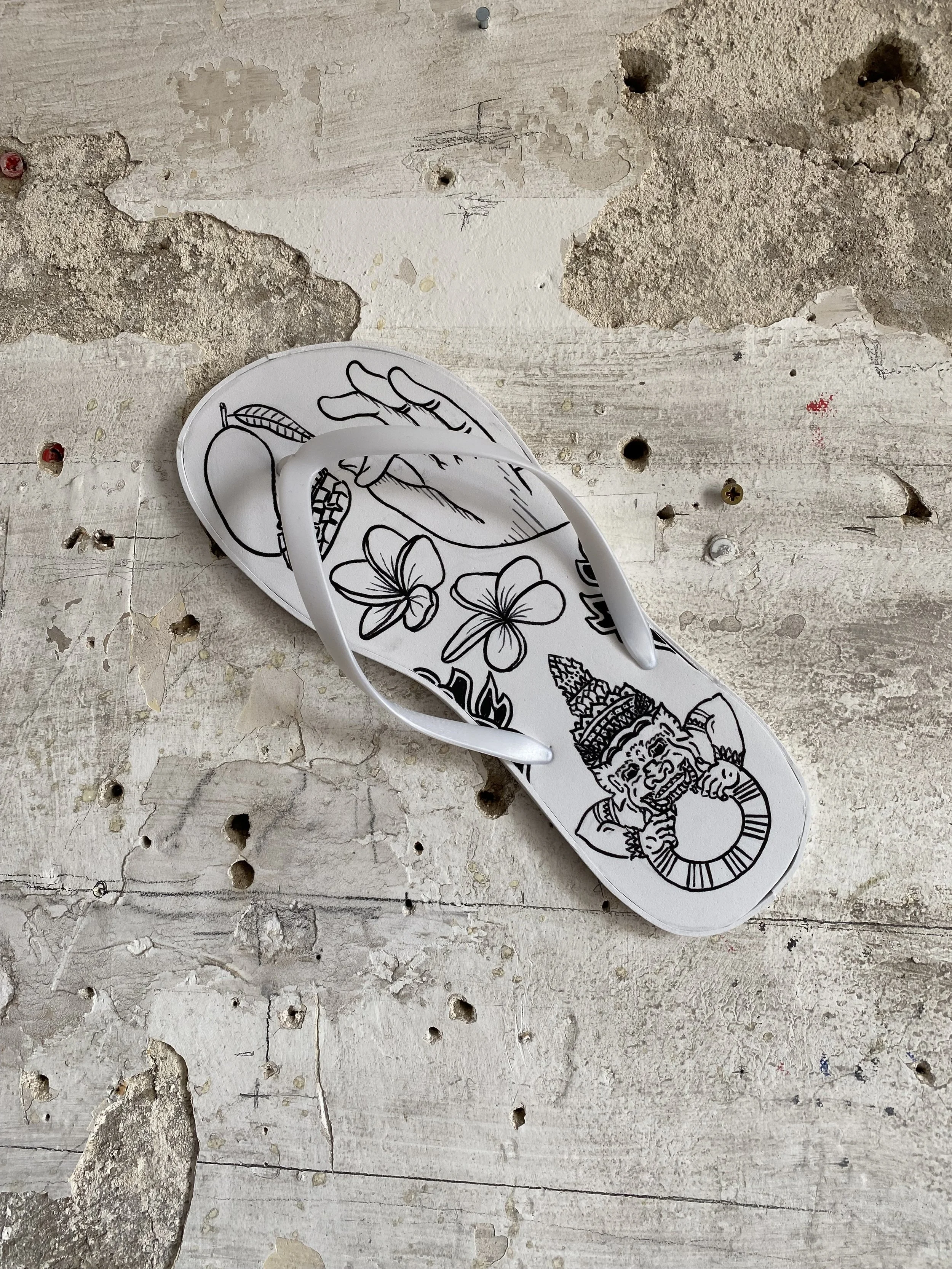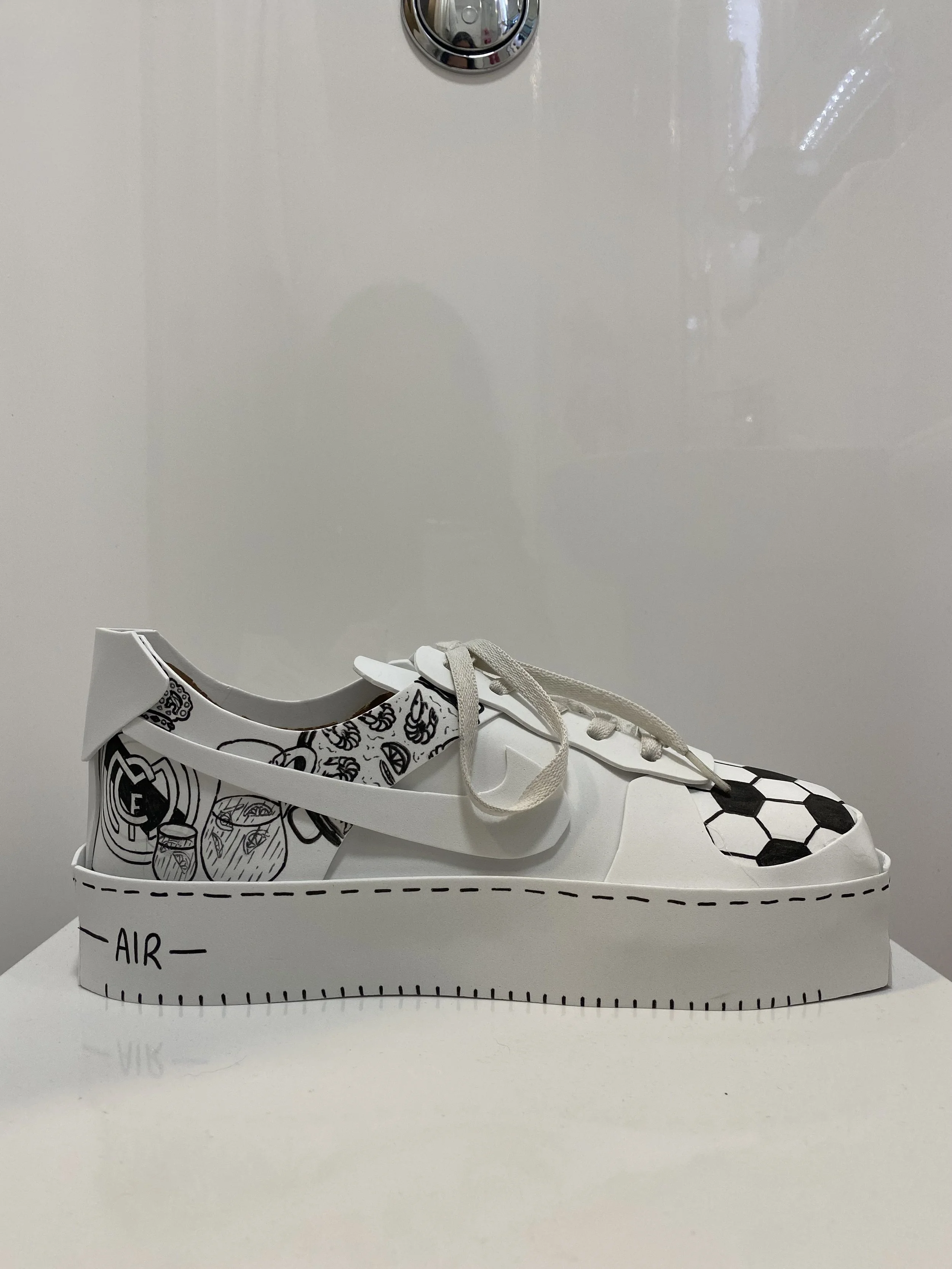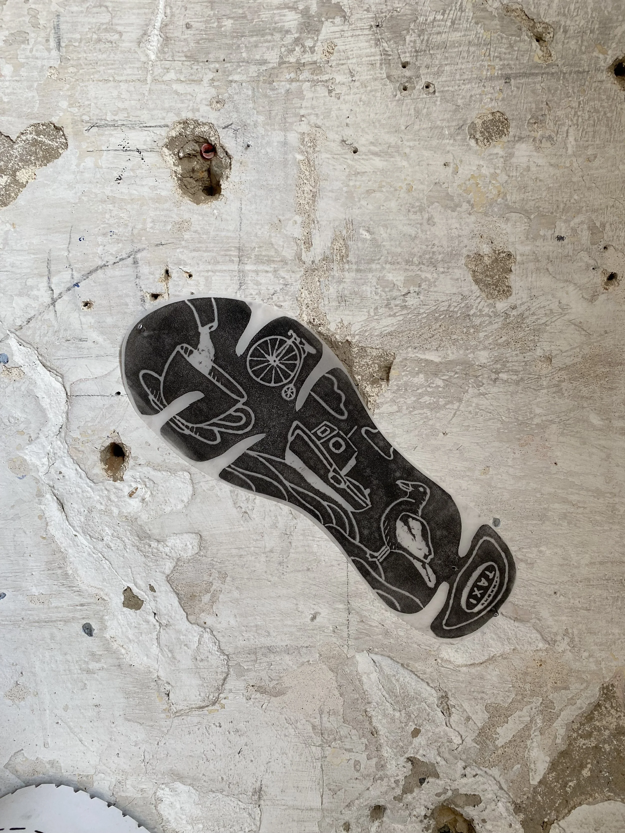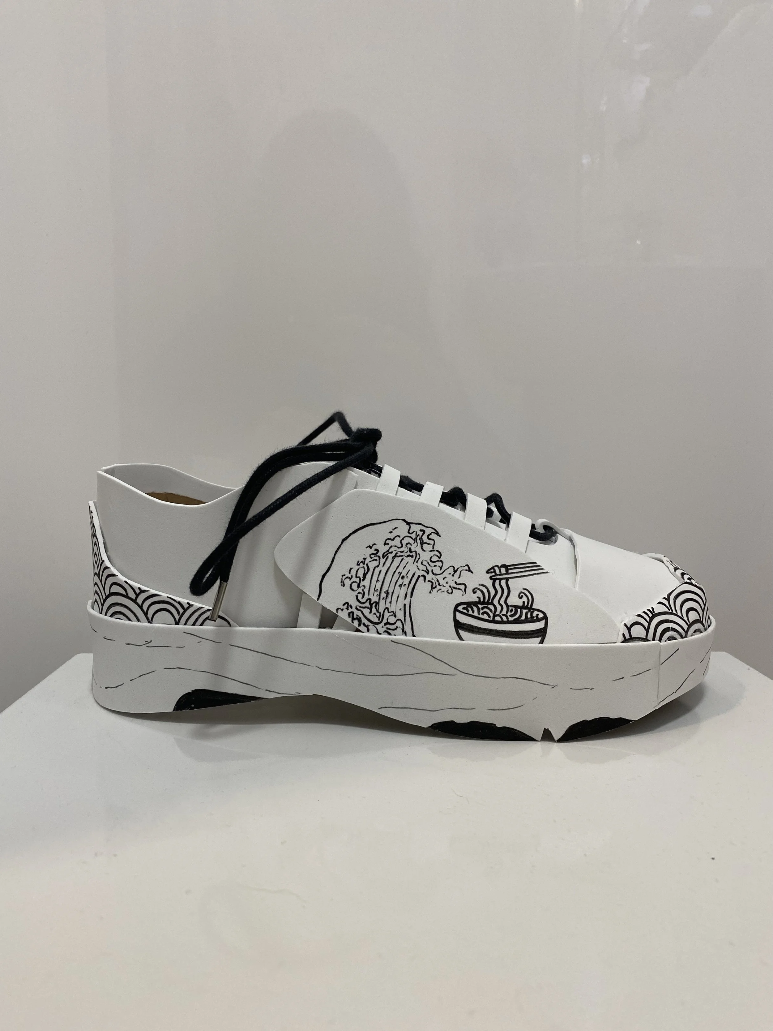 The four shoes and their footprints are representative of four people who have mixed Asian heritage. The surface illustrations on the shoes show the culture that comes through more prominently in their appearance and the illustrations in the footprints show the other half of their ethnicity mix which is not seen as clearly.